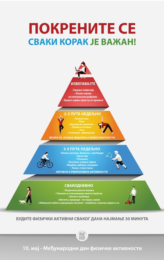 Svake godine, 10. maja, obeležava se Međunarodni dan fizičke aktivnosti, pod sloganom „Kretanjem do zdravlja“. Ovaj važan datum se obeležava u sklopu globalne inicijative koju od 2002. godine sprovode zemlje članice Svetske zdravstvene organizacije (SZO), u cilju ukazivanja na značaj fizičke aktivnosti kao jedne od ključnih aktivnosti za unapređenje zdravlja i dobrobiti svakog čoveka.